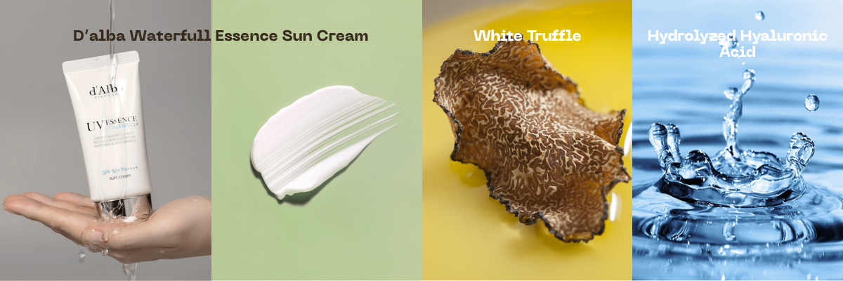 Màu xanh dương: Waterfull Essence Sun Cream — tập trung dưỡng ẩm, finish mịn, ít nâng tone.