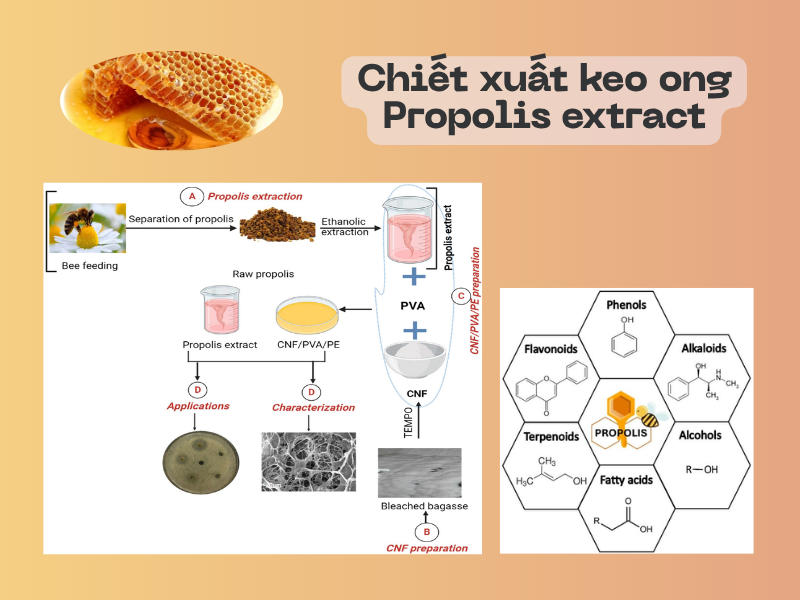 Chiết xuất keo ong (Propolis Extract) là hợp chất tự nhiên được ong mật tạo ra từ nhựa cây, sáp và enzyme, dùng để bảo vệ tổ ong khỏi vi khuẩn, nấm và virus.